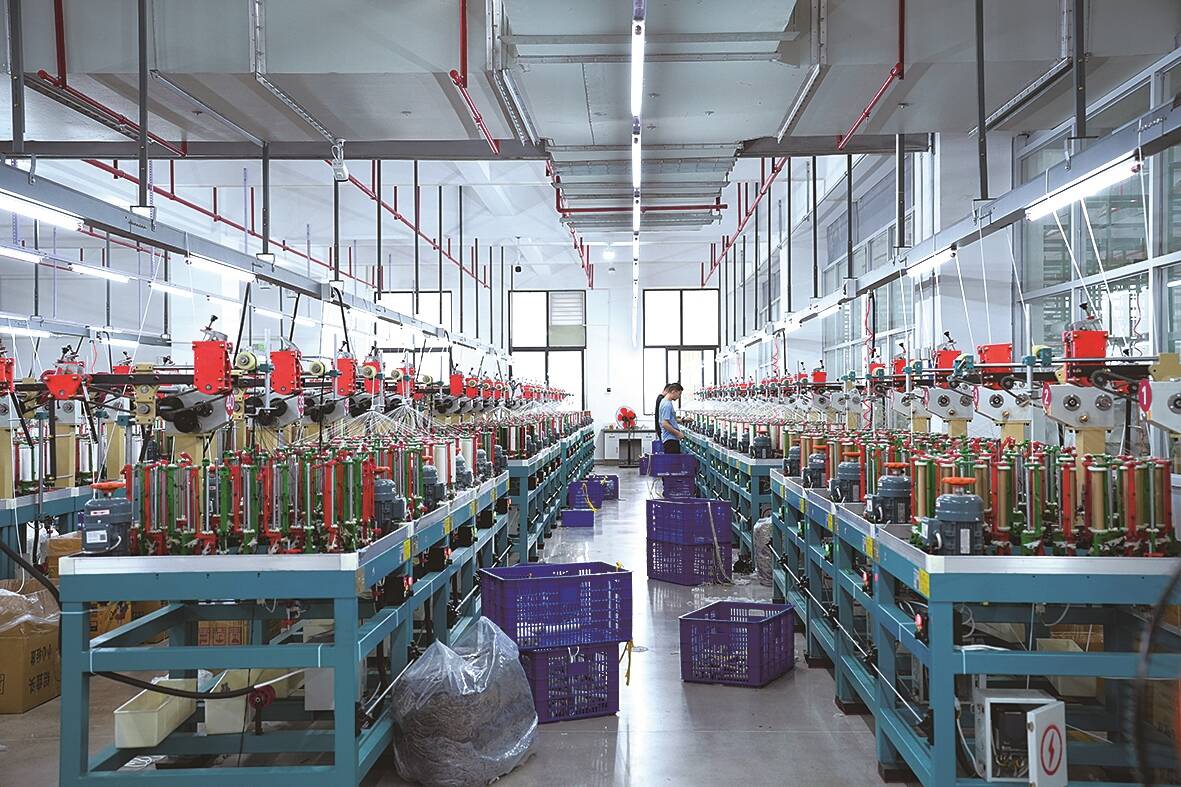 走进华达造物占地60亩、建筑面积达8万平方米的现代化厂区,映入眼帘的是一条条飞速作业的出产线。在智能化数控针织大圆机车间,上下三层楼共500台的主动化大圆织布机规整摆放、高速作业,如春蚕吐丝般将一根根纱线织成皎白如雪的面料;在快速织带机和主动绳子机区域,近300台织带机和绳子机相同满负荷运转,工人们聚精会神地监控着屏幕上的数据,保证每一寸产品的精度。